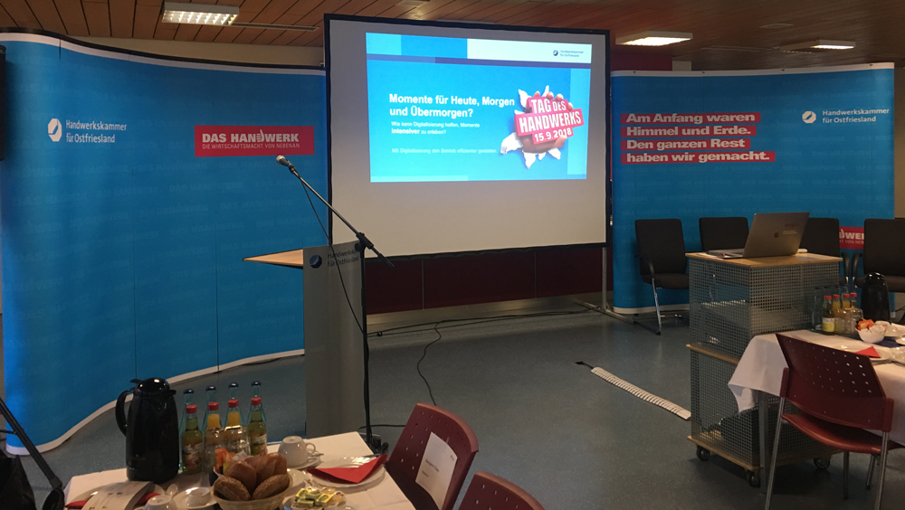 Das abschließende Highlight war dann der Tag des Handwerk am 15.09. in der Handwerkskammer Aurich (Ostfriesland) für mich, in meiner neuen Heimat durfte die den Tag moderieren und einen KeyNote zum Thema „Momente für Heute, Morgen und Übermorgen? – Wie kann Digitalisierung helfen, Momente intensiver zu erleben?“. Hier waren rund 80 Gäste in die Handwerkskammer gekommen und haben neben meinem Input einen Vortrag von einem regionalen Unternehmen zum Thema Digitalsieriung im Handwerk gehört und ich durfte dann eine Podiumsdiskussion führen. Der Präsident hat in seiner Einführung noch einmal deutlich gemacht, wie wichtig das Thema Digitalisieurng für das Handwerk ist. Es wurden spannende Fragen gestellt. In meinem Vortrag habe ich das Thema Wandel, Momente und Kunde in den Mittelpunkt gestellt und daran das Thema Digitalisierung und dessen Mehrwert vorgestellt.