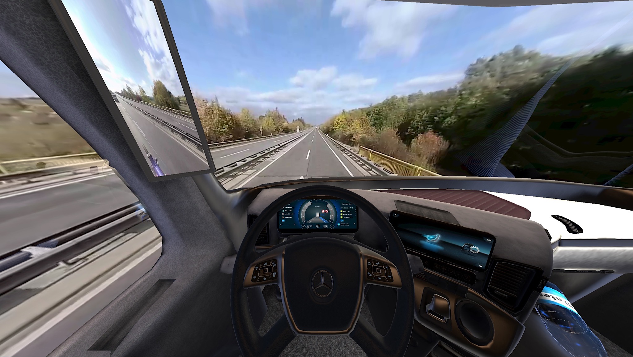 - Blick in die 3D-Brille: Die Lkw-Fahrer sehen beim Test das virtuelle Cockpit des neuen Actros samt Fahrsituation. What truck drivers see in the virtual reality 3D glasses: The digital image of the truck cockpit and driving situations.