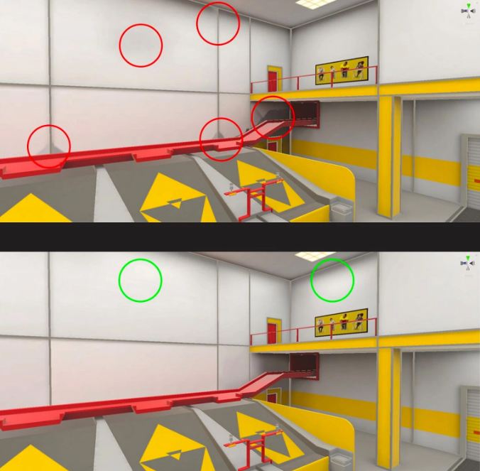 Perhaps the largest changes were in the lighting department, where Immerse says dropping real-time lighting for everything except “absolutely necessary” situations is critical, relying instead on pre-baked lighting into textures, a process that Unity can handle. Fine-tuning the resolution, padding, and size of lightmaps, as well as adjusting each object’s “scale in lightmap” to place higher priority on highly visible items and lower priority on modest ones, will lead to the best automated results, followed by Photoshopping textures to get them exactly where you want them.