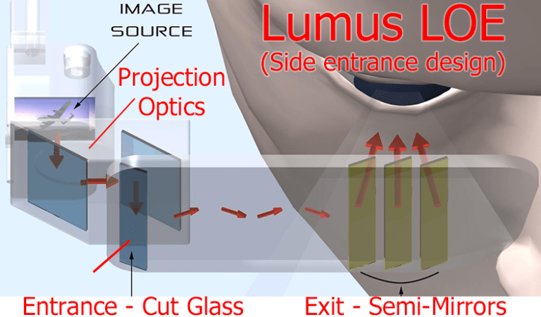 Lumus, with what they call a “Light-guide Optical Element” (LOE), has a single waveguide that works on all colors. The thickness of their one LOE is similar to the stack of multiple (one per red, green, and blue) thinner waveguides on Hololens. They simply cut the waveguide’s entrance at an angle to get the light to enter (rather than use a color specific diffraction grating), and then they use a series of very specially designed partial mirrors to cause the light to exit.