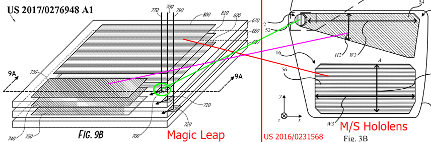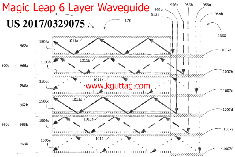 The ML1 and HoloLens use a series of diffraction gratings to make the light enter and exit the waveguide. Hololens has a waveguide for each of red, green, and blue whereas the ML1 as two per each color, for a total of 6 waveguides, to support their focus planes concept. I discussed the ML1 and Hololens waveguides some more in part 1 (see the “Background on Diffraction Waveguides” section).